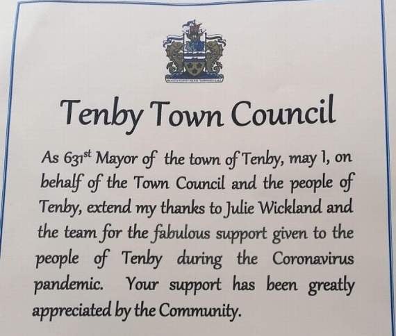 “On behalf of the town council and the people of Tenby, may I extend my thanks to Julie and the team for the fabulous support given to the people of Tenby during the Coronavirus pandemic - your support has been greatly appreciated by the community,” said Tenby Mayor, Clr. Mrs. Samantha Skyrme-Blackhall.