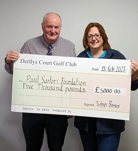 Last month, the Golf Club held its Annual General Meeting, and at the beginning of the meeting Sandra Dade, charity manager of the Paul Sartori Foundation, met the captain of the Club, Mr Teifryn Bowen, to receive a cheque for £5,000.